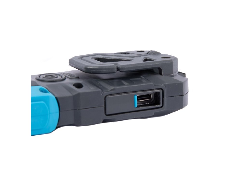 Robustní montážní nabíjecí svítilna s magnety, háčkem a kloubem. Pogumovaný povrch zajišťuje pohodlnou manipulaci. Hlavní světlo doplňuje praktická horní LED dioda pro přímý svit. Nabíjecí port USB-C. USB kabel je součástí balení. Doporučená nabíječka: 5 V/2 A